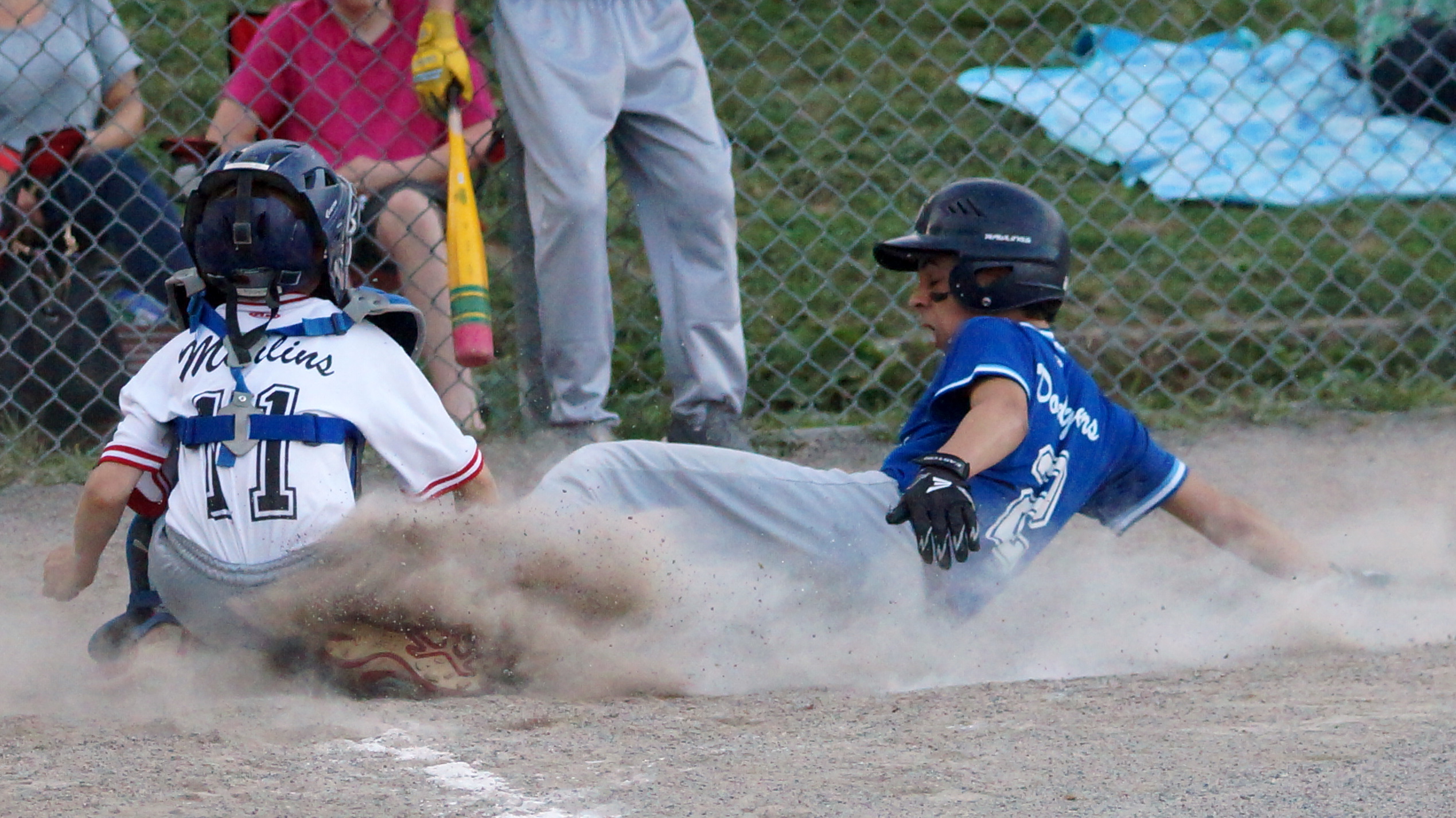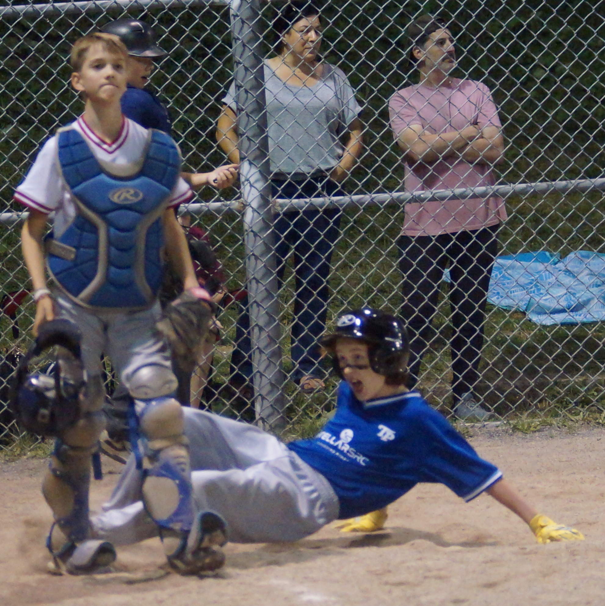 In a chitty chitty bang bang play at the dish, Marlins baserunner Issy (5) beats the tag of Dodgers starter Owen (5) by the skin of his teeth to score a run on a wild pitch by the Dodgers in the first inning.