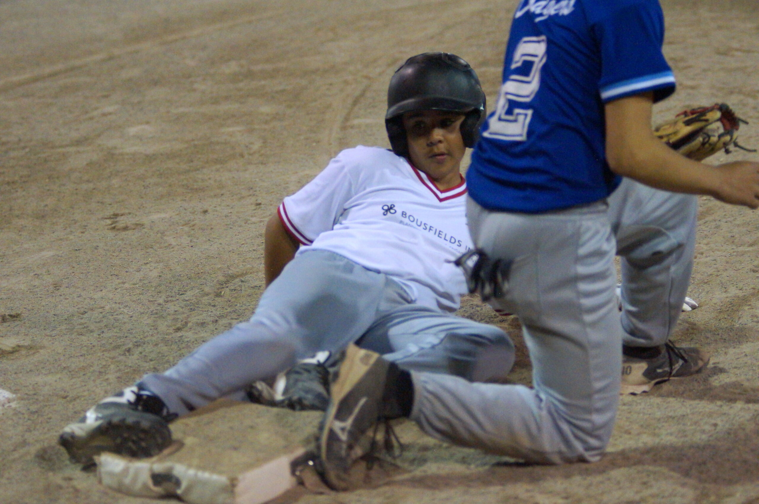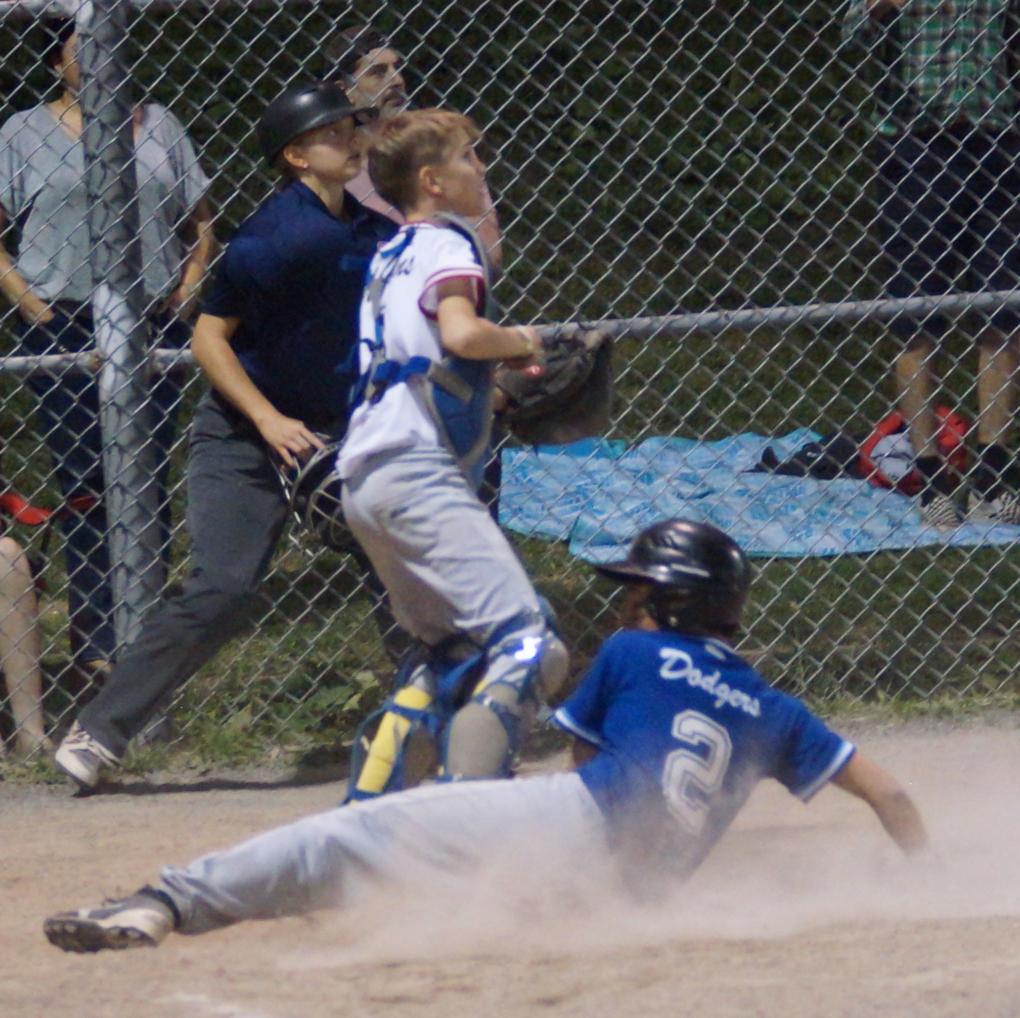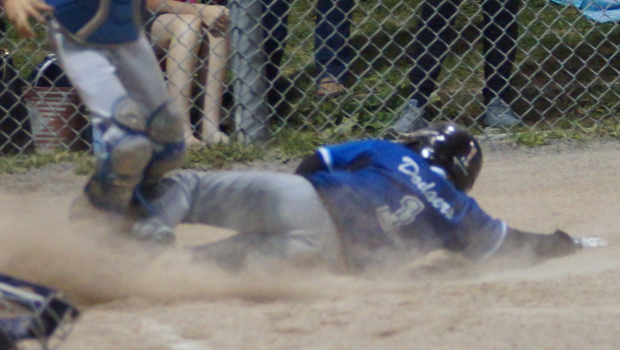 Dodgers baserunner Lennox (13) scores to make it three run affair in the sixth frame.