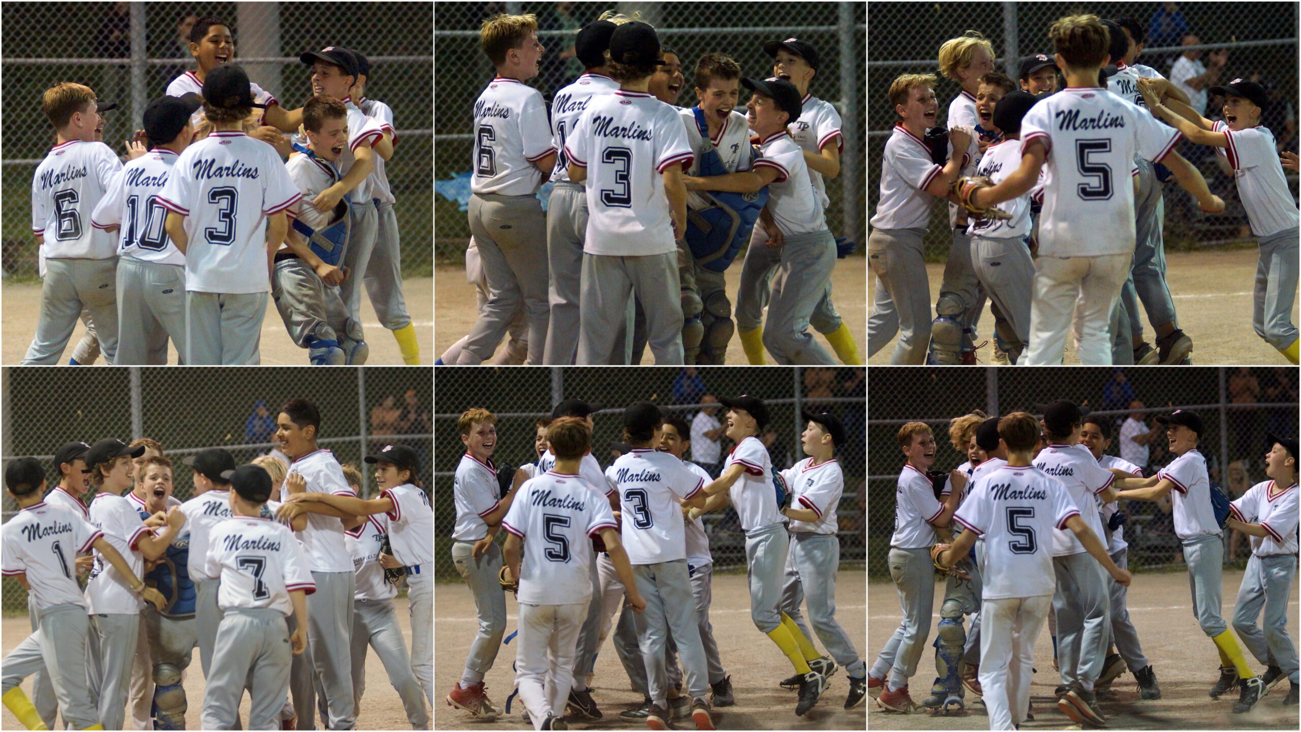 Clockwise from top left: Following the final out in the bottom of the seventh inning, the Marlins celebrate their 2025 TPBA House League Tournament 13U Peewee Division Championship Game victory at Christie Pits Diamond 2.